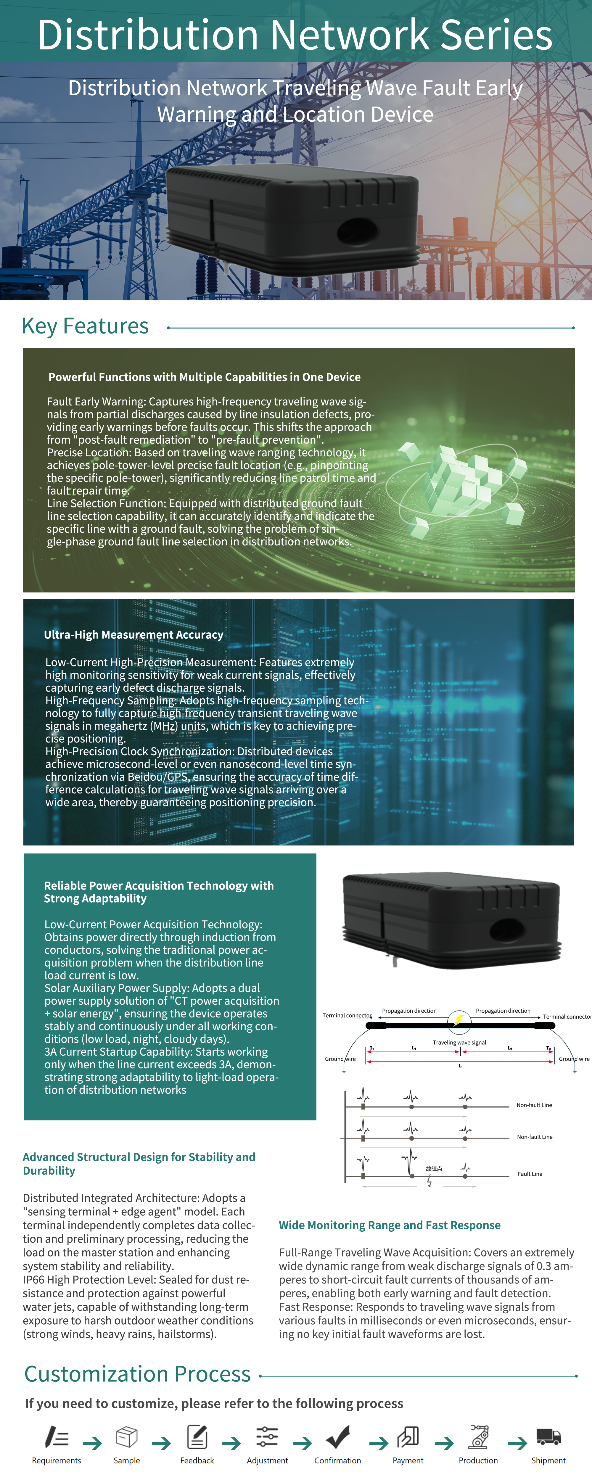 The distribution network travelling wave fault warning and location device is installed along distribution line conductors. Utilising travelling wave distance measurement technology, it synchronously collects high-frequency travelling wave currents and power frequency currents across the distribution network. It provides line defect discharge warning, precise fault location at the pole level, and distributed ground fault selection capabilities.